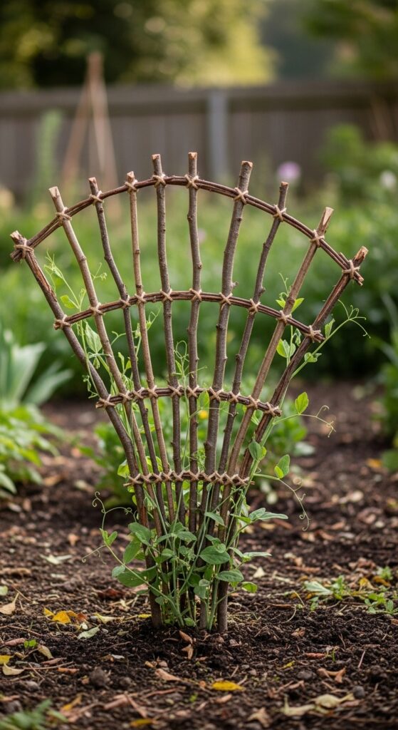 Start with one central stake pushed firmly into the soil. Then add more stakes on either side, fanning outward at increasing angles. Connect horizontal twigs across them as you go up, tying at each junction. The finished shape is a perfect fan or peacock-tail form that climbing plants absolutely adore because they can spread naturally as they grow.