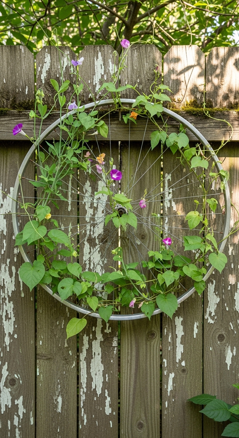 Mount the wheel horizontally on a post above a container or garden bed, or attach it vertically to a fence or wall. The spokes act as perfect supports for your climbing plants, and the circular form creates an eye-catching visual feature. Lightweight annual vines like morning glory or black-eyed Susan vine work especially well here.