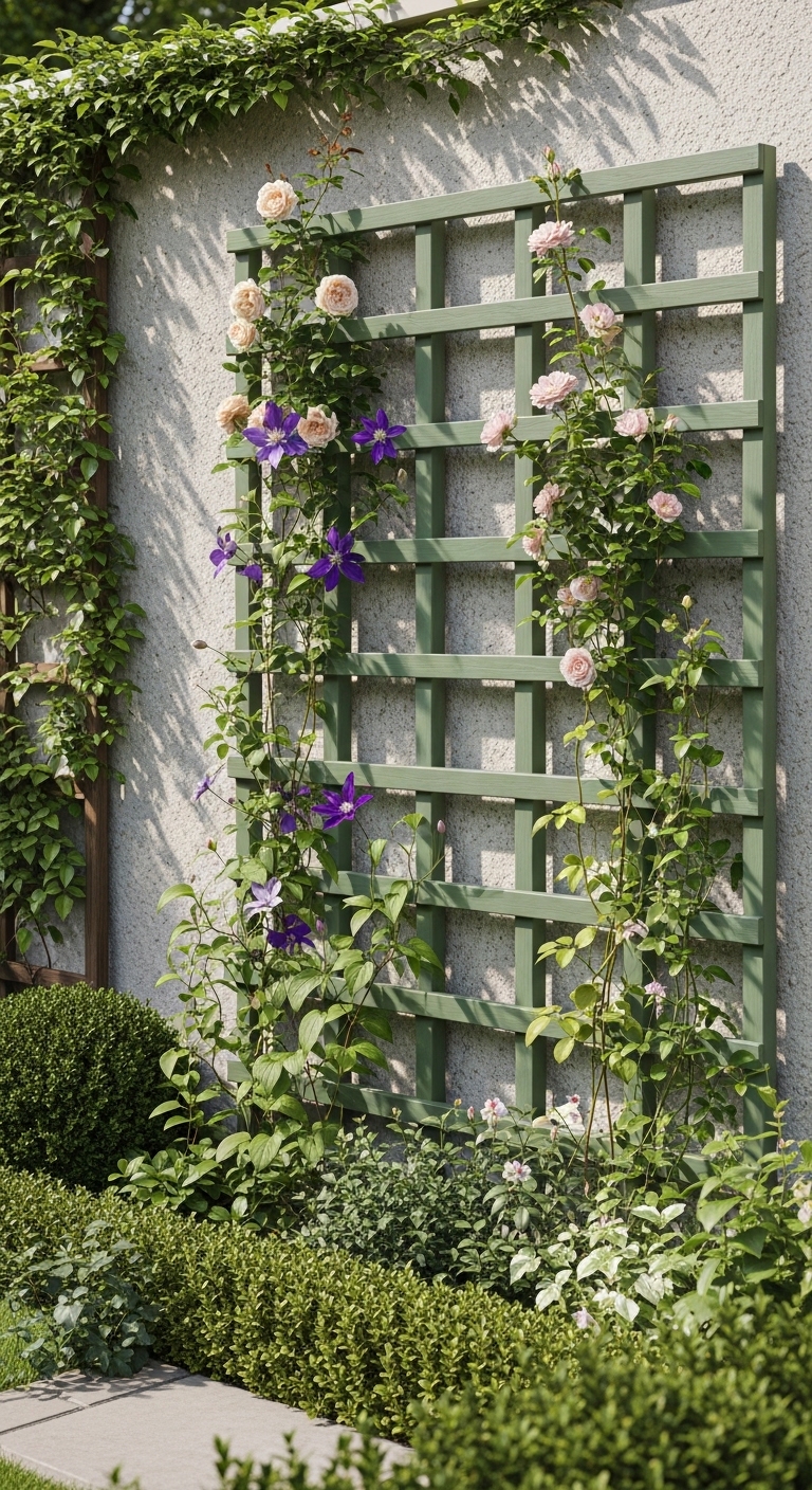 This design works particularly well for climbing roses, fan-trained fruit trees, and flowering vines against a wall or fence.