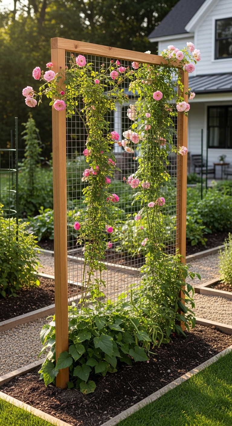 Build a simple rectangular wooden frame from 2×4 lumber. Then staple or attach a piece of hog wire panel to the back of the frame. Stand it upright between posts or anchor it directly into the ground. The result is a strong, open-grid trellis that handles heavy plants with ease.