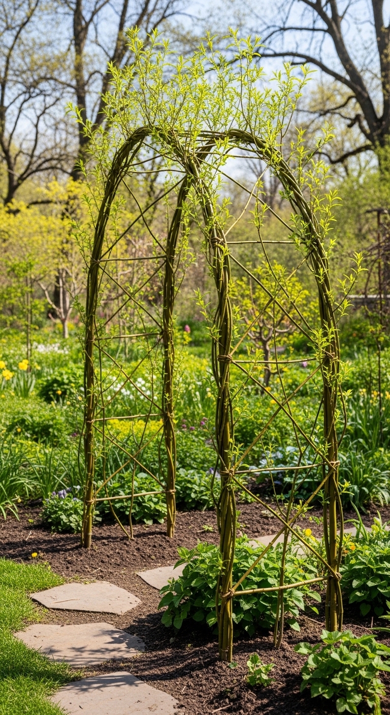 We saved one of the most magical ideas for last. A living willow trellis is exactly what it sounds like — a trellis made from fresh willow cuttings that actually takes root and grows. Over time, the structure itself becomes alive.