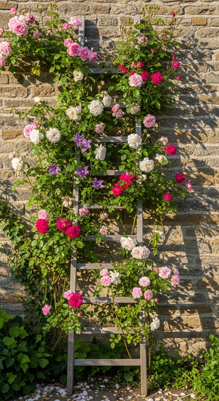 This works especially beautifully with clematis, sweet peas, or climbing hydrangeas. The visual combination of the ornate frame with lush flowering vines is genuinely breathtaking.