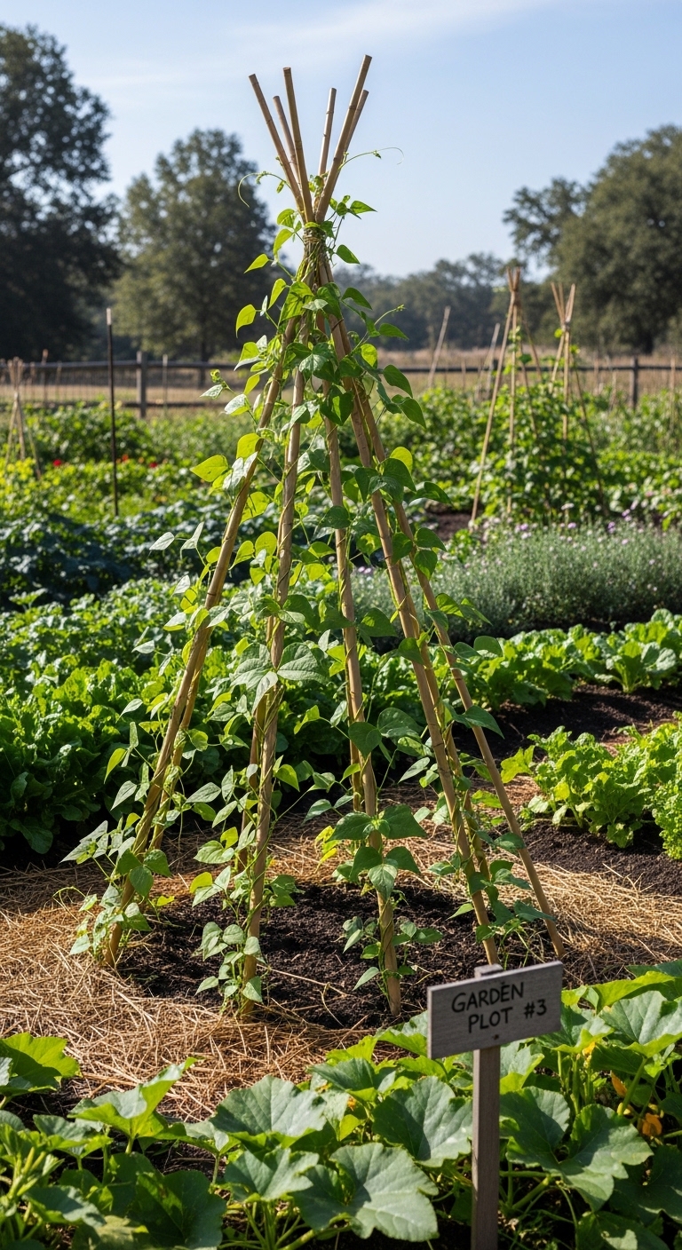 If you grow beans, peas, or any kind of vining vegetable, a bamboo teepee trellis might become your absolute best friend in the garden. It’s one of the fastest builds on this list — we’re talking 15 minutes, maybe less.