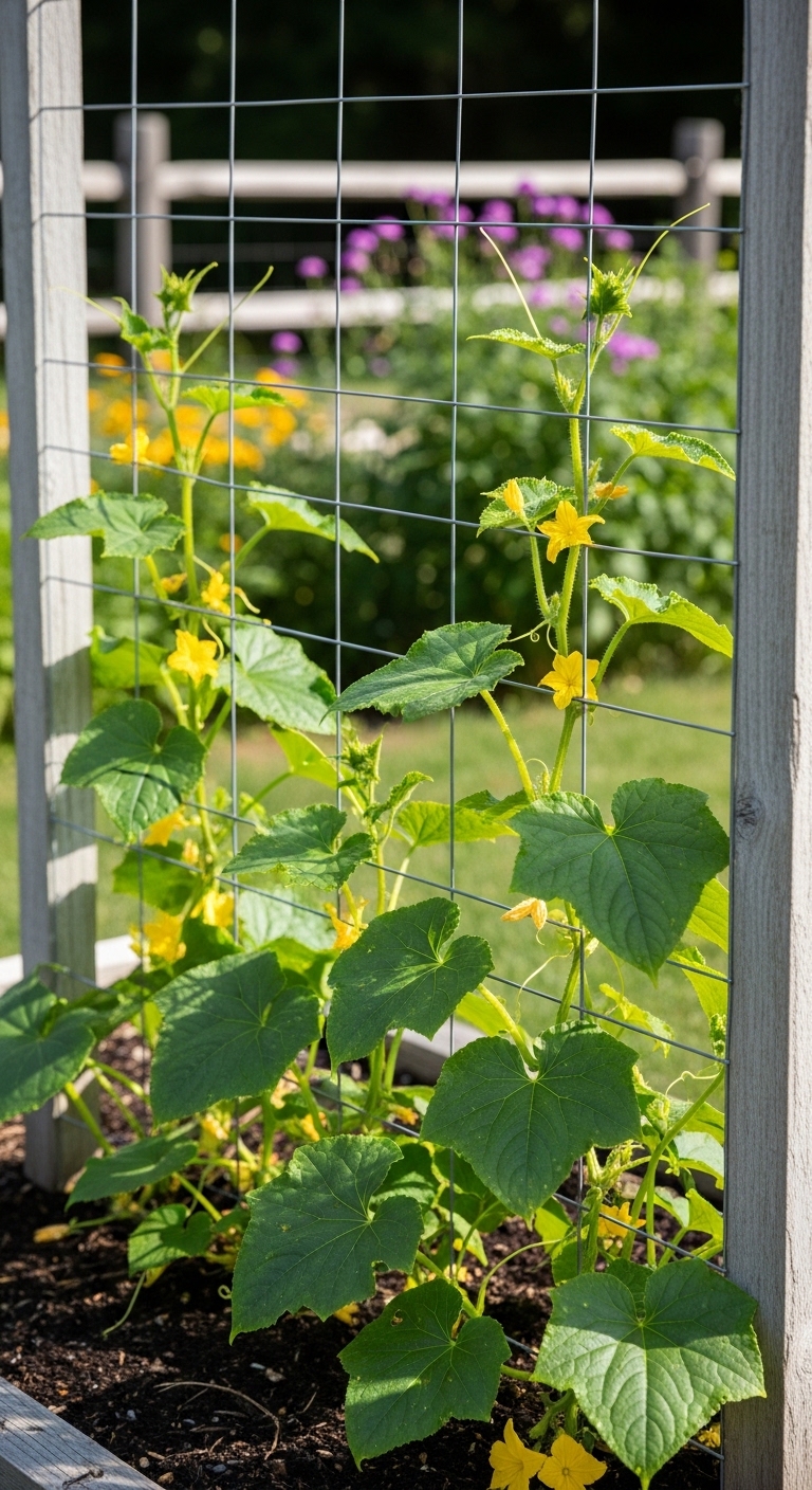 Cucumbers, tomatoes, and squash all thrive on a wire trellis like this. The plants grab the wire naturally, and you get excellent airflow which helps prevent fungal diseases.