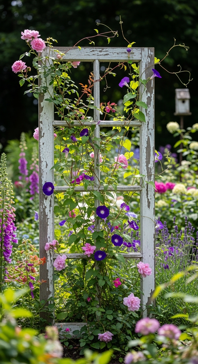 This one genuinely stops people in their tracks. An old window frame — the kind you’d normally see at a salvage yard or thrift store — makes one of the most romantic, character-filled trellises you’ll ever see in a garden.