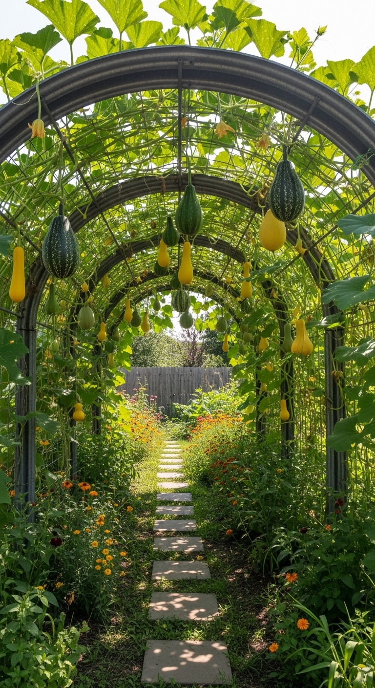 Cattle panels are heavy-gauge welded wire grids typically used for livestock fencing. They’re strong enough to hold the weight of large fruiting plants like squash, melons, and pumpkins — which is something most trellises simply can’t do. When you bend one into an arch over a garden path, you create an incredible tunnel effect where fruits literally hang down overhead as you walk through. It’s one of those garden features that makes visitors gasp.