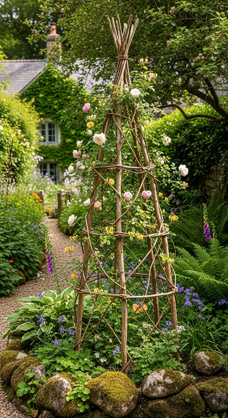 The irregular, natural pattern this creates is part of the charm. No two are exactly alike. Sweet peas and lightweight climbing flowers look absolutely magical growing through this kind of structure.