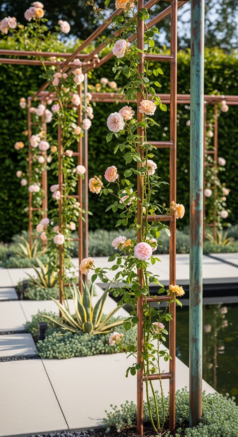 For gardeners who want something that looks genuinely high-end, a copper pipe trellis is your answer. Copper ages beautifully — over time it develops a gorgeous blue-green patina that looks expensive and artistic in a garden setting.