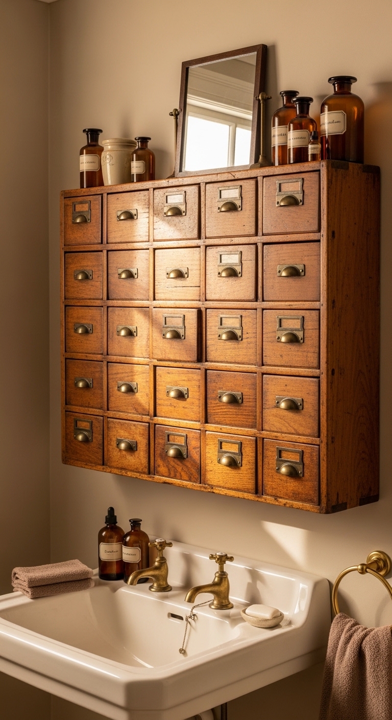 If your bathroom has more of a classic or eclectic personality, a vintage-style apothecary cabinet adds incredible character. These are typically multi-drawer units inspired by old pharmacy furniture, and they give your space a curated, collected feel.