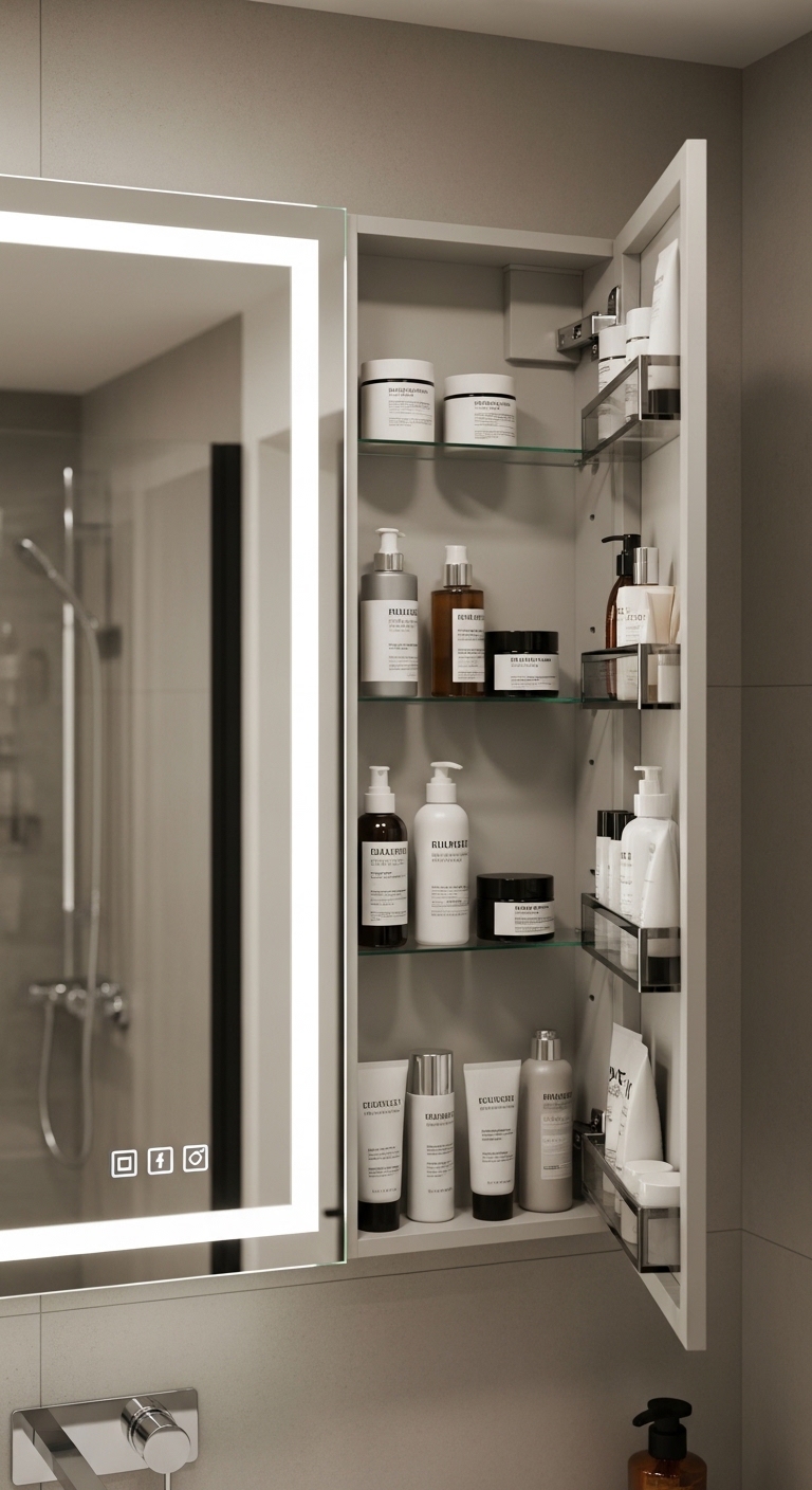 If you share a bathroom, a tri-fold mirror cabinet with separate sections on each side is genuinely life-changing. You each get your own organized zone without any arguments about who took whose shelf space.