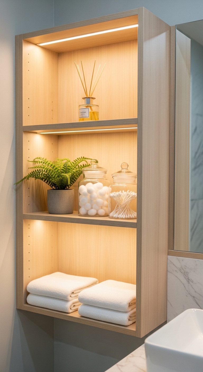 Not everything in your bathroom needs to be hidden. Open-shelf cabinets — think framed units with no doors — let you show off beautifully folded towels, matching bottles, and decorative accents while still keeping things organized.