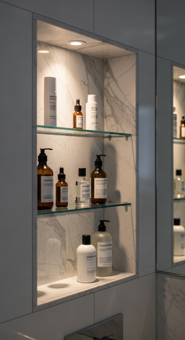 Built-in niches are small recessed shelves or cabinets cut into the wall space between studs. In showers, they hold shampoo and soap. Above sinks, they keep daily essentials at arm’s reach. On open bathroom walls, they add character and depth.
