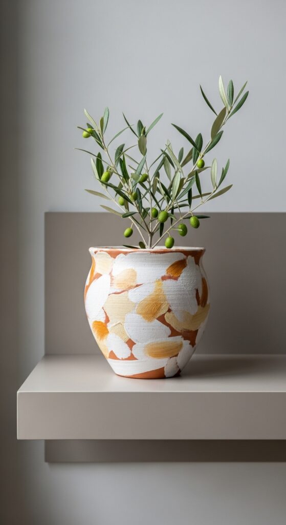 Stick to an earthy neutral palette — warm whites, creamy beiges, soft tans, and muted greens — and your abstract pot will look sophisticated and intentional even if you painted it in ten minutes.