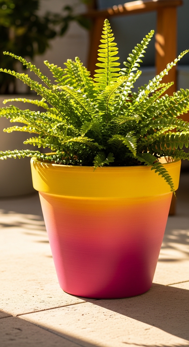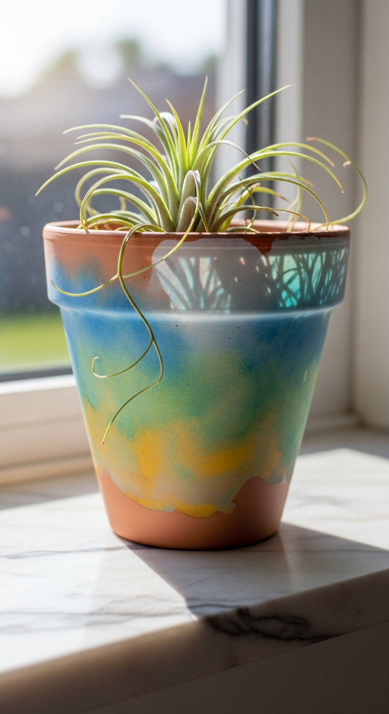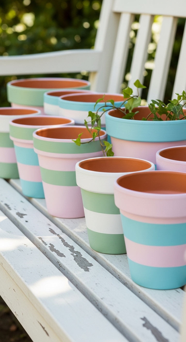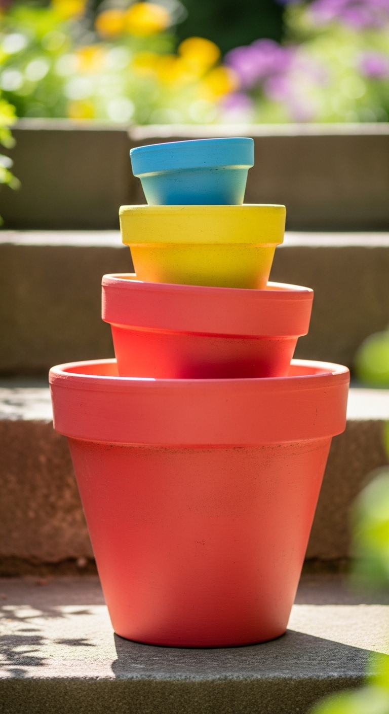 This last idea is a showstopper. Take three or five terracotta pots of graduating sizes and paint each one a different color from a coordinated palette — think the warm rainbow tones of terracotta, yellow, and soft teal, or a cool palette of lavender, periwinkle, and sage.