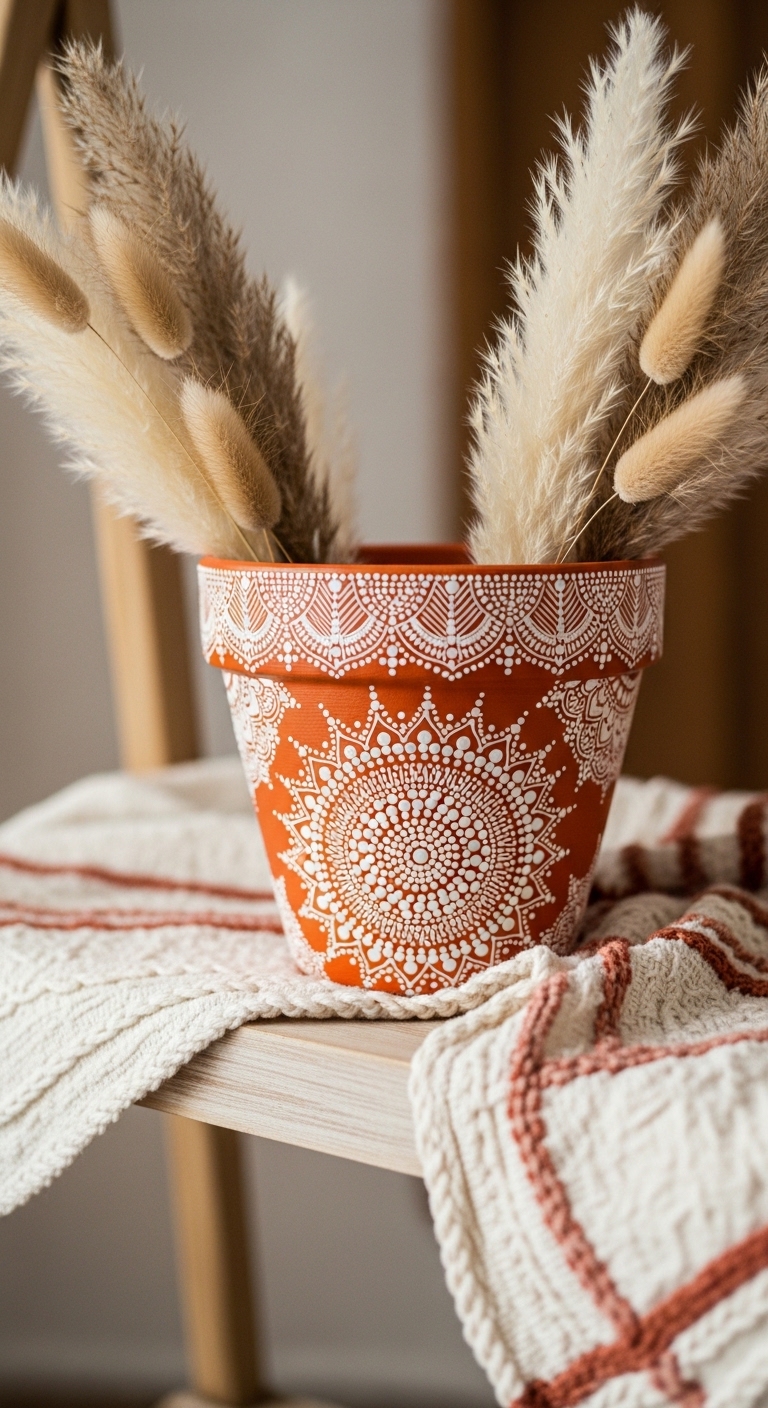 If you love the bohemian aesthetic, a mandala-painted pot is going to be your favorite project. The circular, layered patterns feel meditative to paint and absolutely stunning when finished.