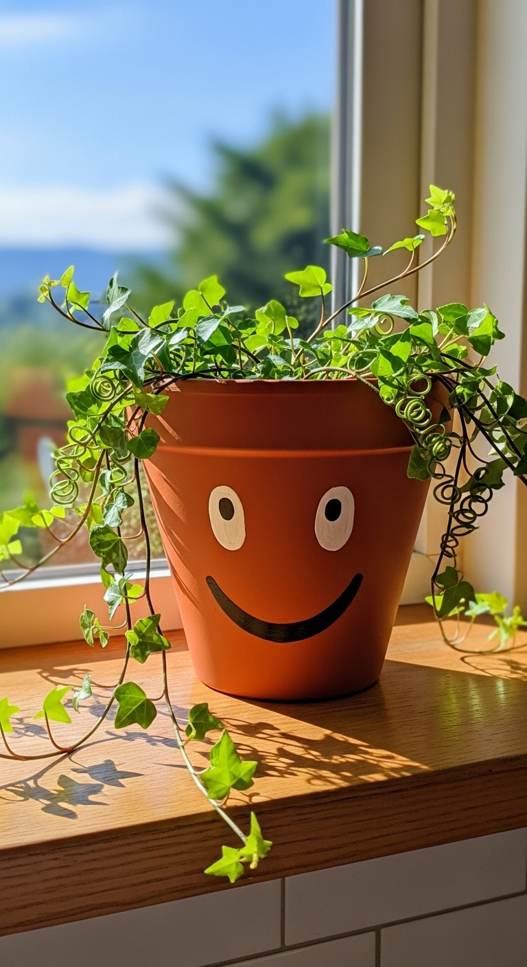 This one is pure joy. Painting simple facial expressions on your pots — wide eyes, a little smile, round cheeks — and then letting your plant act as the “hair” is one of those ideas that makes every single person smile when they see it.