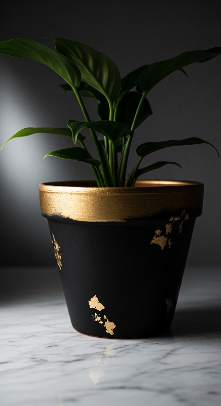 If you want your pots to look like they came straight from a high-end boutique, a black and gold combination is your answer. Paint the pot matte black first, then dry-brush gold paint lightly over the rim, raised edges, and base.