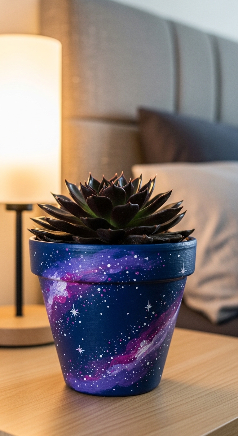 A galaxy-themed pot sounds ambitious, but the technique is actually incredibly beginner-friendly. You build it up with layers of sponged color — deep navy or black as the base, then purple and teal sponged over the top while wet, finishing with tiny dots of white for stars.