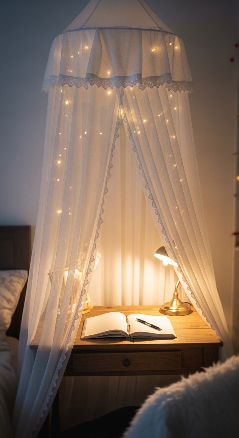 If you want your study nook to feel like a retreat rather than a workstation, add a canopy. A simple sheer fabric canopy draped from a ceiling hook over your corner desk creates an enclosed, intimate feeling that genuinely reduces distraction.