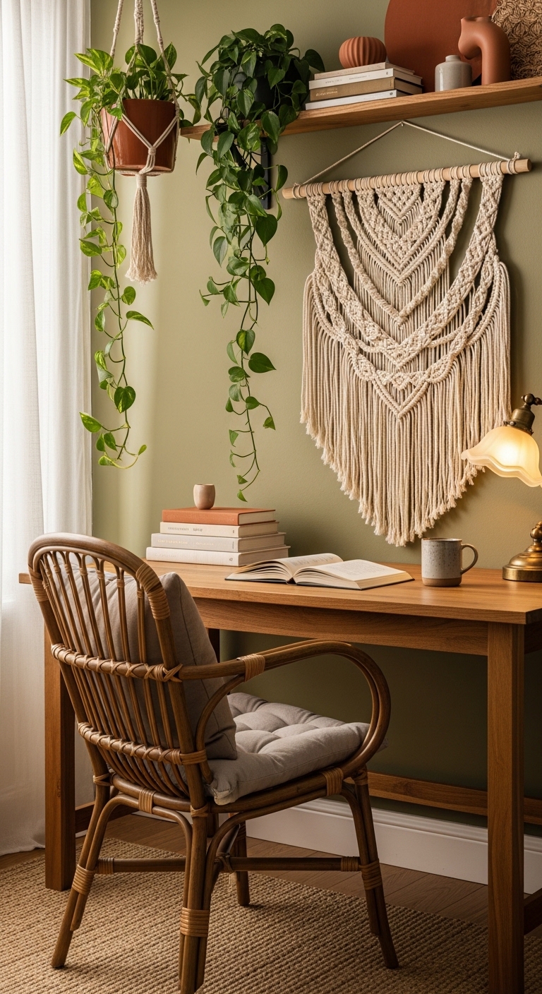 Sometimes the best way to fight the frustration of a small indoor space is to bring the outside in. An outdoor-inspired study nook leans into natural materials — rattan, bamboo, wood, woven textures — and fills the space with living plants.