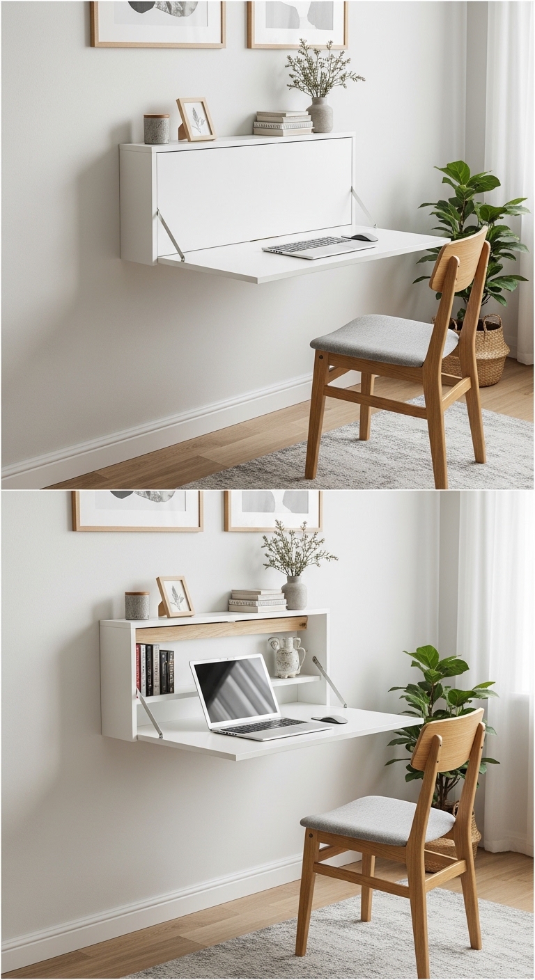 A fold-down wall desk is perhaps the most space-efficient study solution that exists. When closed, it looks like a decorative panel or cabinet on your wall. When open, it drops down to reveal a usable desk surface.
