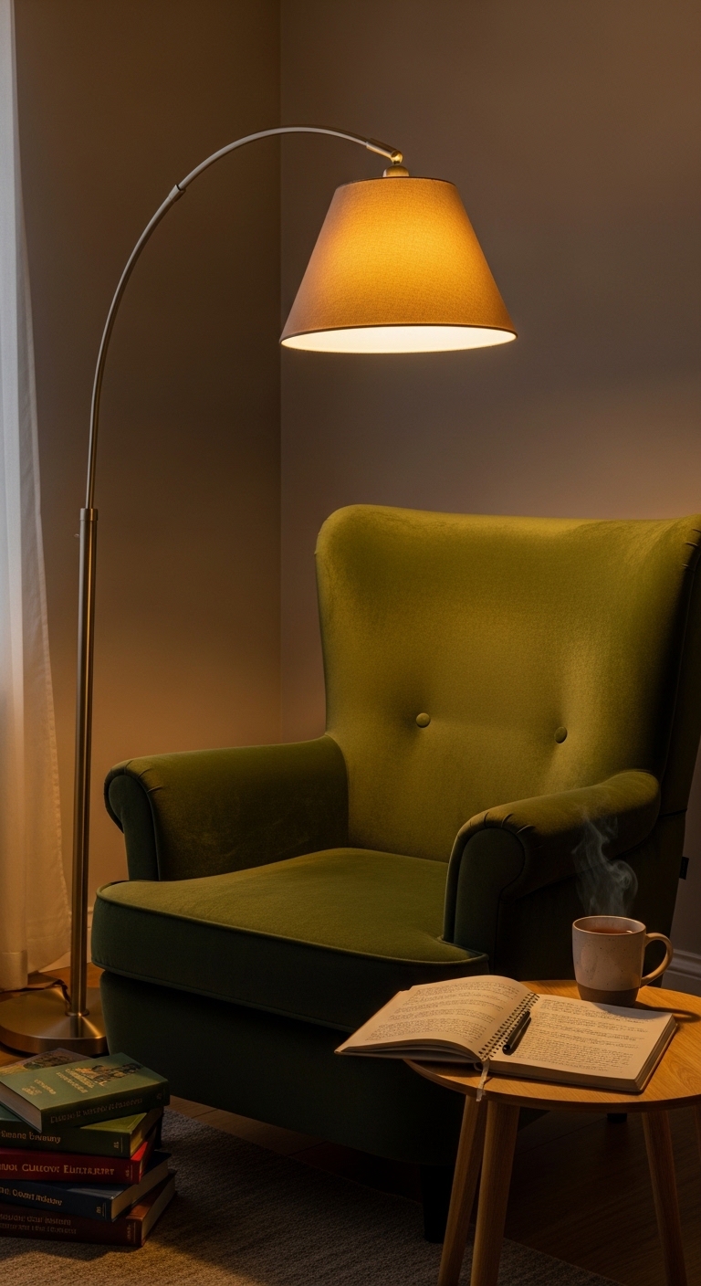 Not every study session needs a traditional desk. For light reading, reviewing notes, or brainstorming, a well-designed armchair corner is all you need. The key is the lighting — a good arc floor lamp that positions light directly over your shoulder makes all the difference.