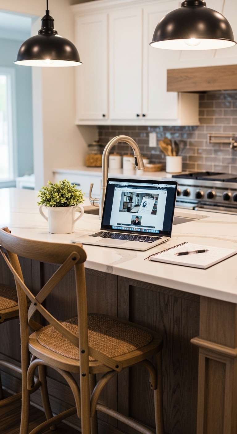 Kitchen counters — especially the end sections or peninsula edges — are underrated study surfaces. If you live alone or your mornings are quiet, pulling a bar stool up to an unused stretch of counter gives you a surprisingly effective quick-work station.