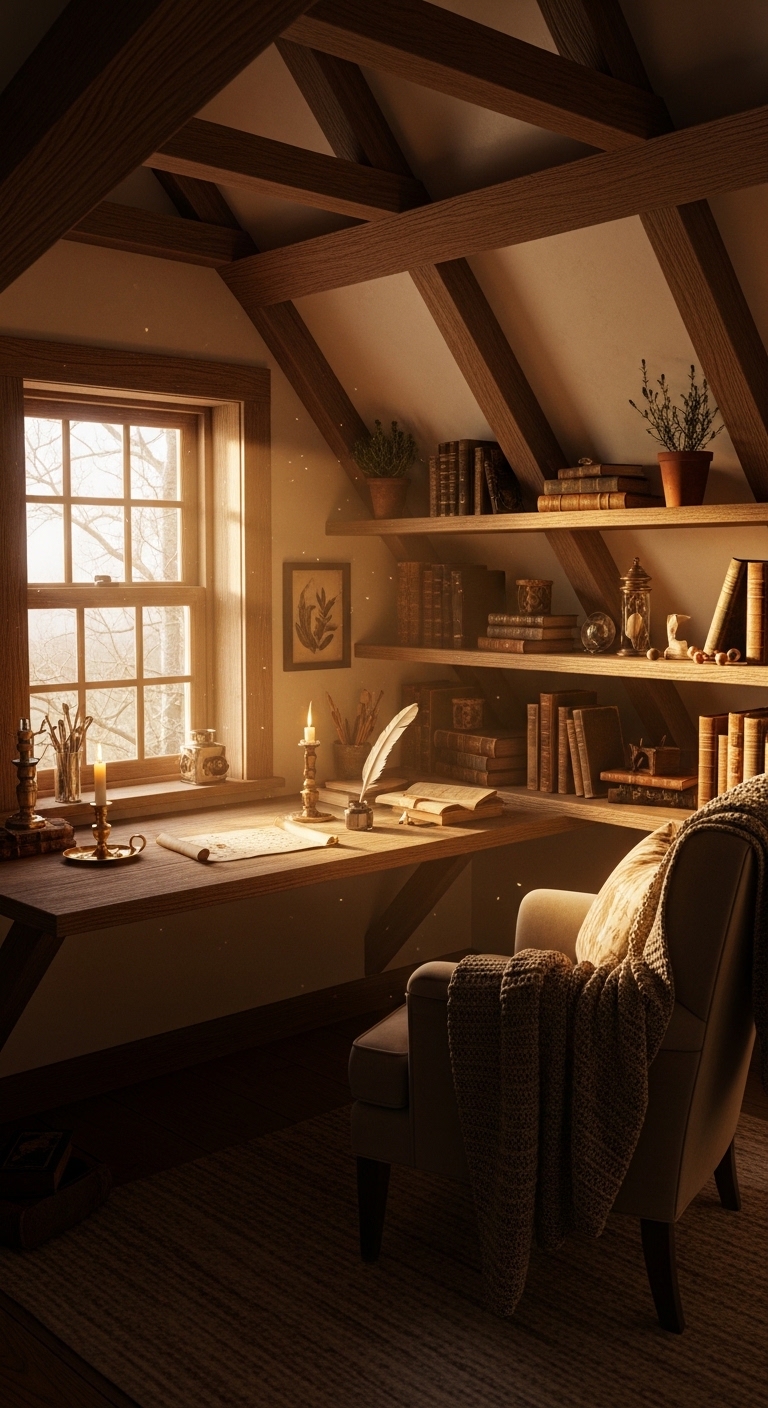 If you have any attic space with even a small dormer window, it’s one of the most charming study nooks you can create. The slanted ceiling feels intentionally intimate, the dormer window floods the space with focused natural light, and the whole setup feels removed from the rest of the house in the best possible way.