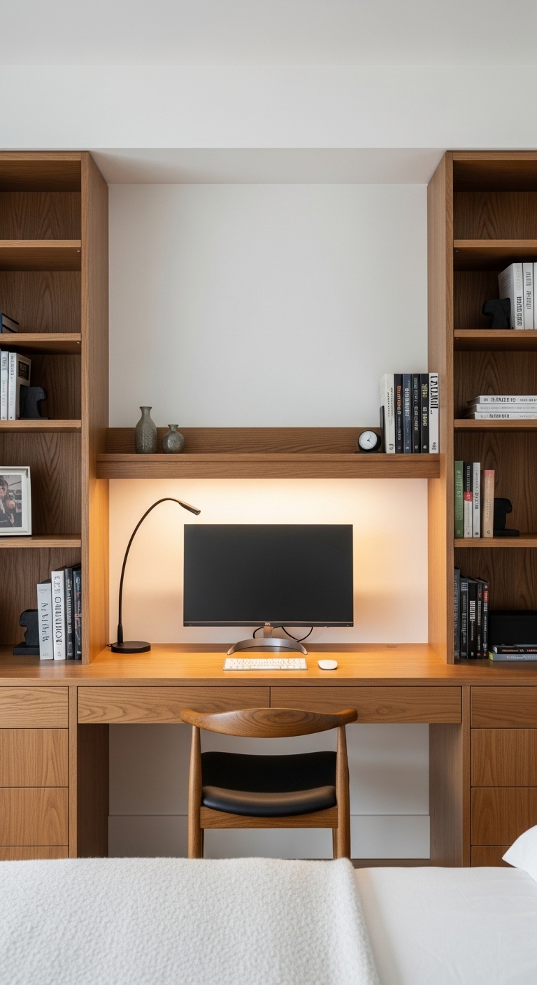 A built-in desk that’s part of a larger wall unit takes a small bedroom from cramped to magazine-worthy. By integrating the desk into the shelving system, everything feels cohesive and intentional. There are no awkward floating furniture pieces — just one unified piece that uses every inch of vertical space.
