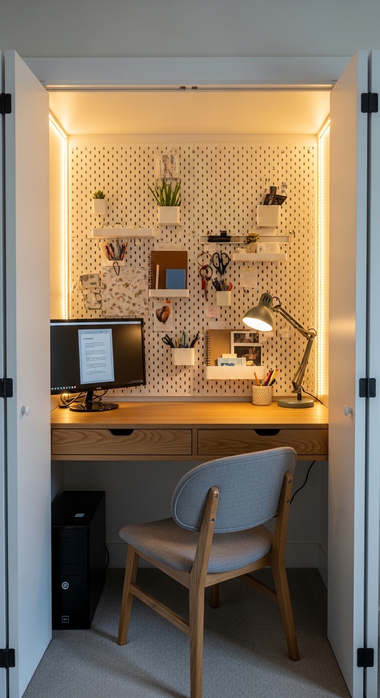 This is one of the smartest moves in small-space living. Take any closet — even a shallow coat closet — remove the hanging rod, and install a floating desk at the right height. The back wall becomes your bulletin board, pegboard, or shelf zone.