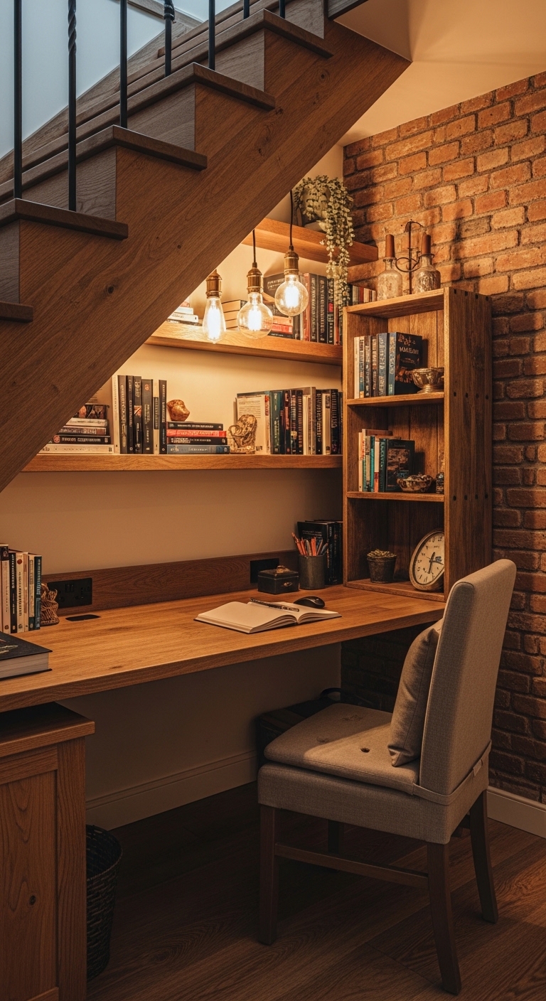 The space under your stairs is almost always wasted. A small built-in desk that follows the natural slant of the staircase turns it into the coziest little nook imaginable. It feels almost like a secret study, tucked away from the rest of the house.