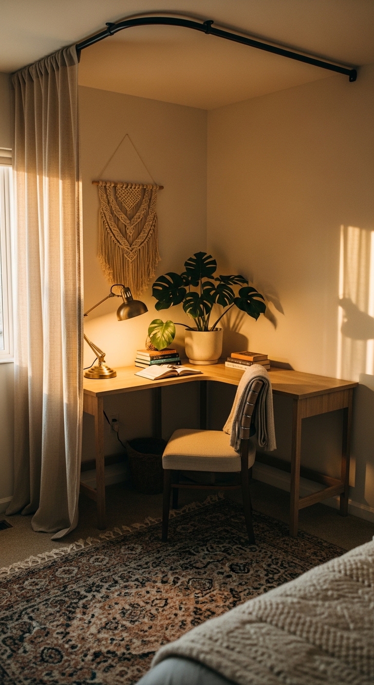If you share a bedroom or studio apartment, creating visual separation without building actual walls is a game changer. A ceiling-mounted curtain rod with a sheer or blackout curtain can define your study zone beautifully.