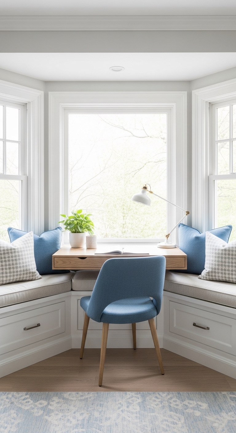 Bay windows are an absolute gift for small-space study nooks. The wraparound seating gives you a comfortable, enclosed feeling, and the natural light from three sides keeps the space bright without needing overhead lights.