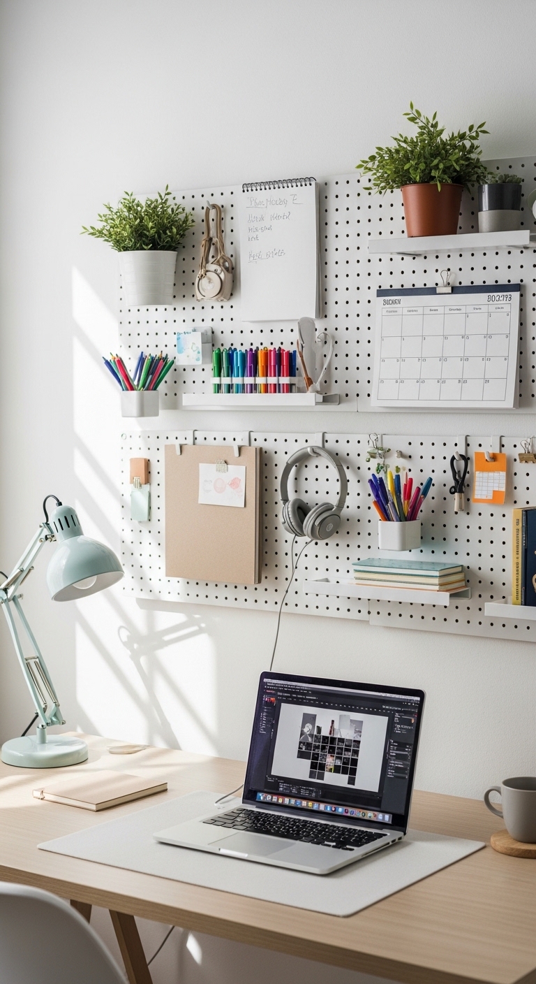 Pegboards aren’t just for garages. When you mount one above your desk, you gain vertical storage that keeps your entire workspace organized without taking up any desk surface. Everything has a home — your pens, scissors, headphones, sticky notes, even a small shelf for a plant.