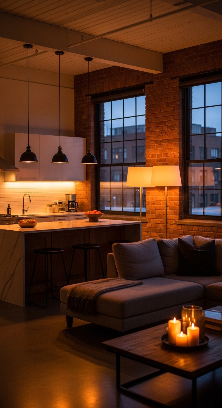 Lofts are notorious for one problem: harsh overhead lighting that flattens everything and destroys the mood. The fix is layered lighting — using multiple light sources at different heights and intensities.