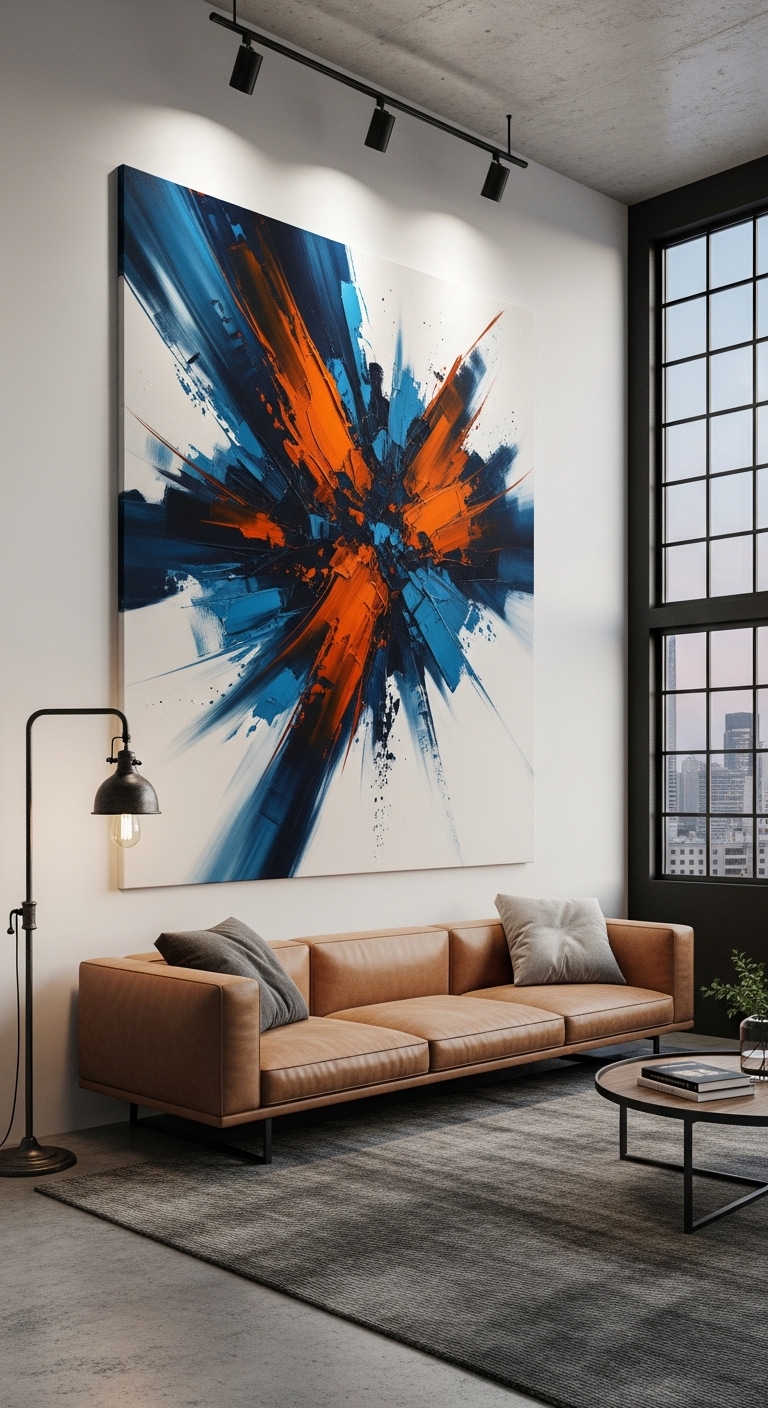 Standard-sized art looks like a postage stamp in a loft. To make your walls feel designed rather than empty, go oversized. A single large abstract canvas — 4 feet wide and 5 feet tall or bigger — has more visual impact than a gallery wall of smaller pieces.