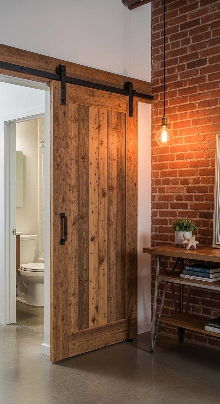 Reclaimed wood with visible grain and a black metal track is the classic choice. For a more modern look, try a frosted glass panel on a steel track — it keeps light moving through the space while maintaining privacy.