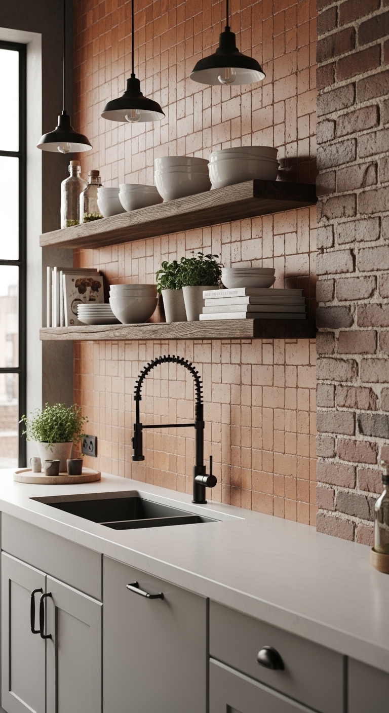 Layer warm tones against it — terracotta, camel, deep forest green, or navy all sing against brick. Hang oversized framed art in bold, graphic prints. Add trailing plants on floating shelves that let greenery drape down the brick face. Warm-toned Edison bulb fixtures bring out the red and orange in the brick and create an evening atmosphere that feels straight out of a boutique hotel.