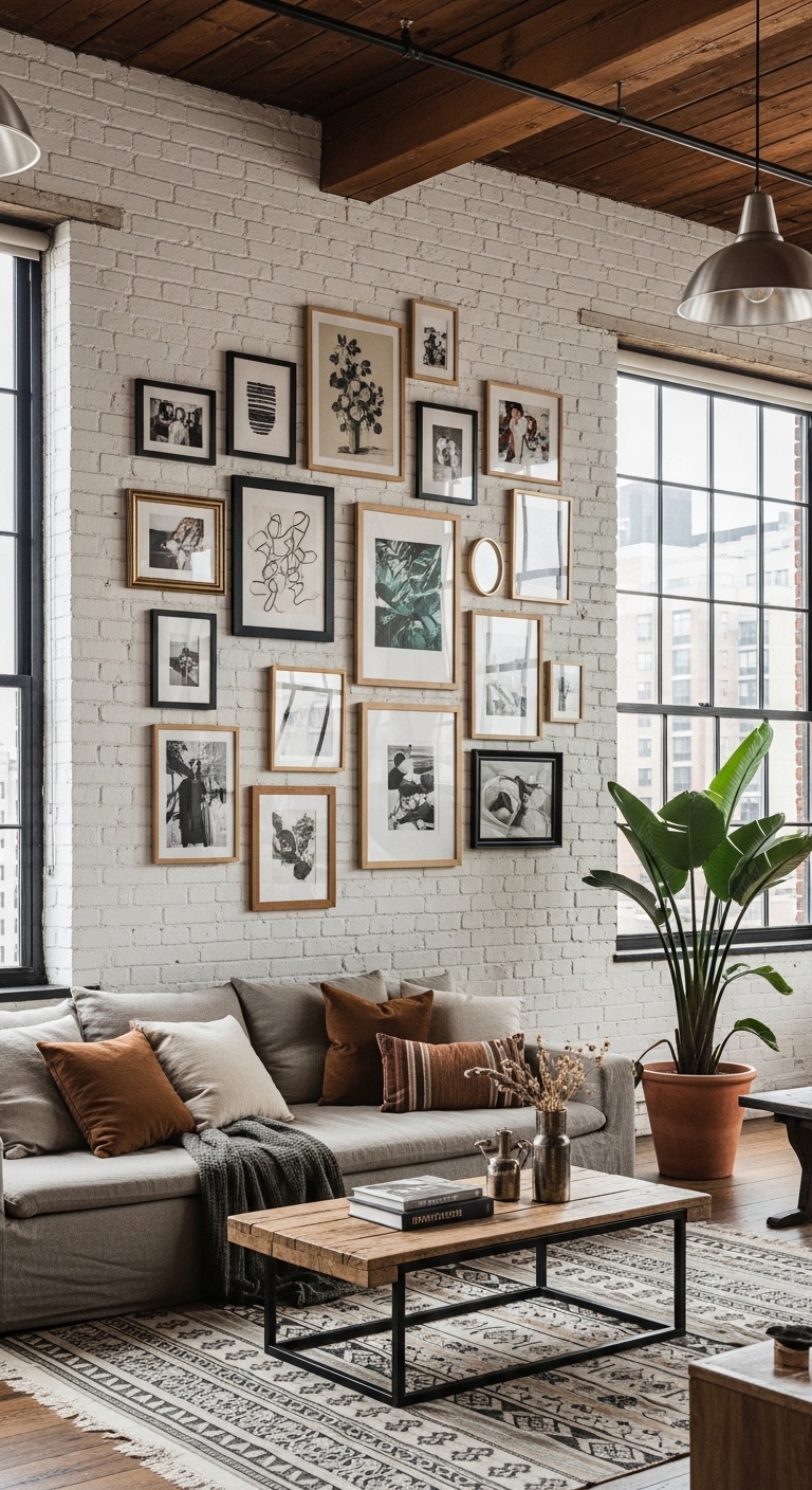 A well-executed gallery wall is one of the fastest ways to inject personality into a loft. The trick with loft gallery walls is scale — they need to be bigger than you’d hang in a regular home.