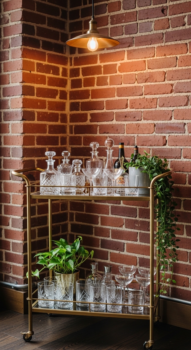 A dedicated drink station adds both function and personality to a loft. A vintage brass bar cart is the easiest entry point — moveable, affordable, and endlessly stylish when loaded with glass decanters, glassware, and a small plant.