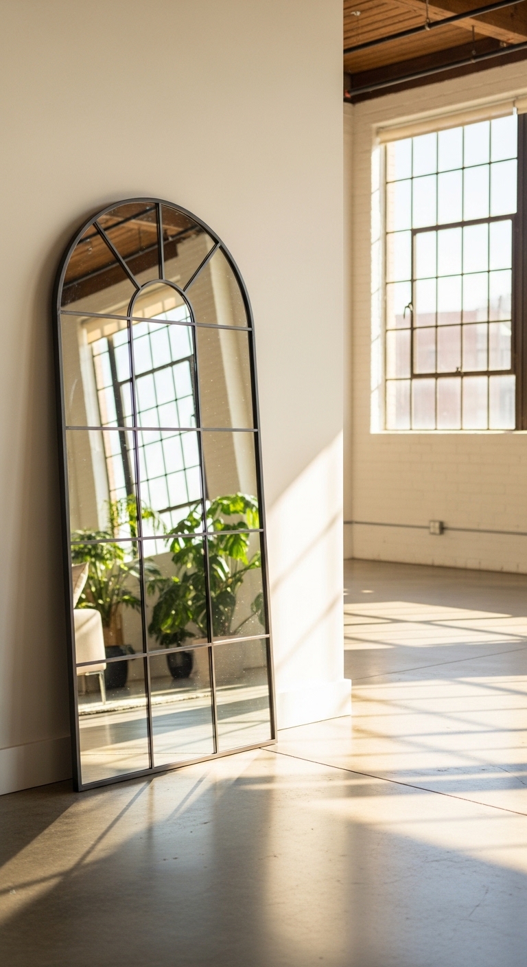 In a loft with high ceilings and large windows, mirrors are multipliers — they capture natural light and throw it deeper into the space. One large leaning mirror against a wall does more for your loft’s light and perceived size than five smaller mirrors combined.