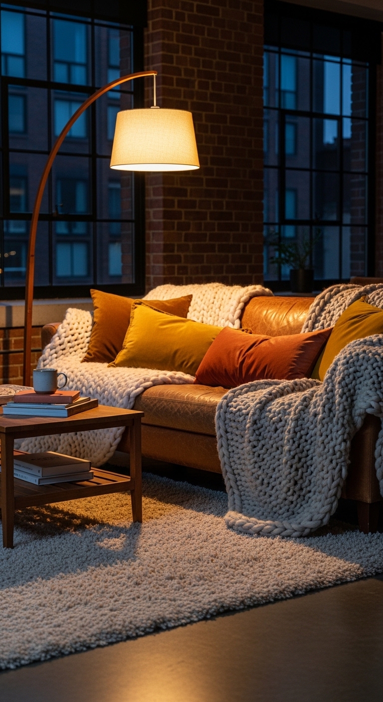 Stack throws on the sofa arm. Layer cushions in velvet, linen, and knit. Add a shaggy rug beside the bed. Hang a heavy linen curtain panel in a warm tone. Every textile you add reduces echo, adds visual warmth, and makes the space feel genuinely lived-in.