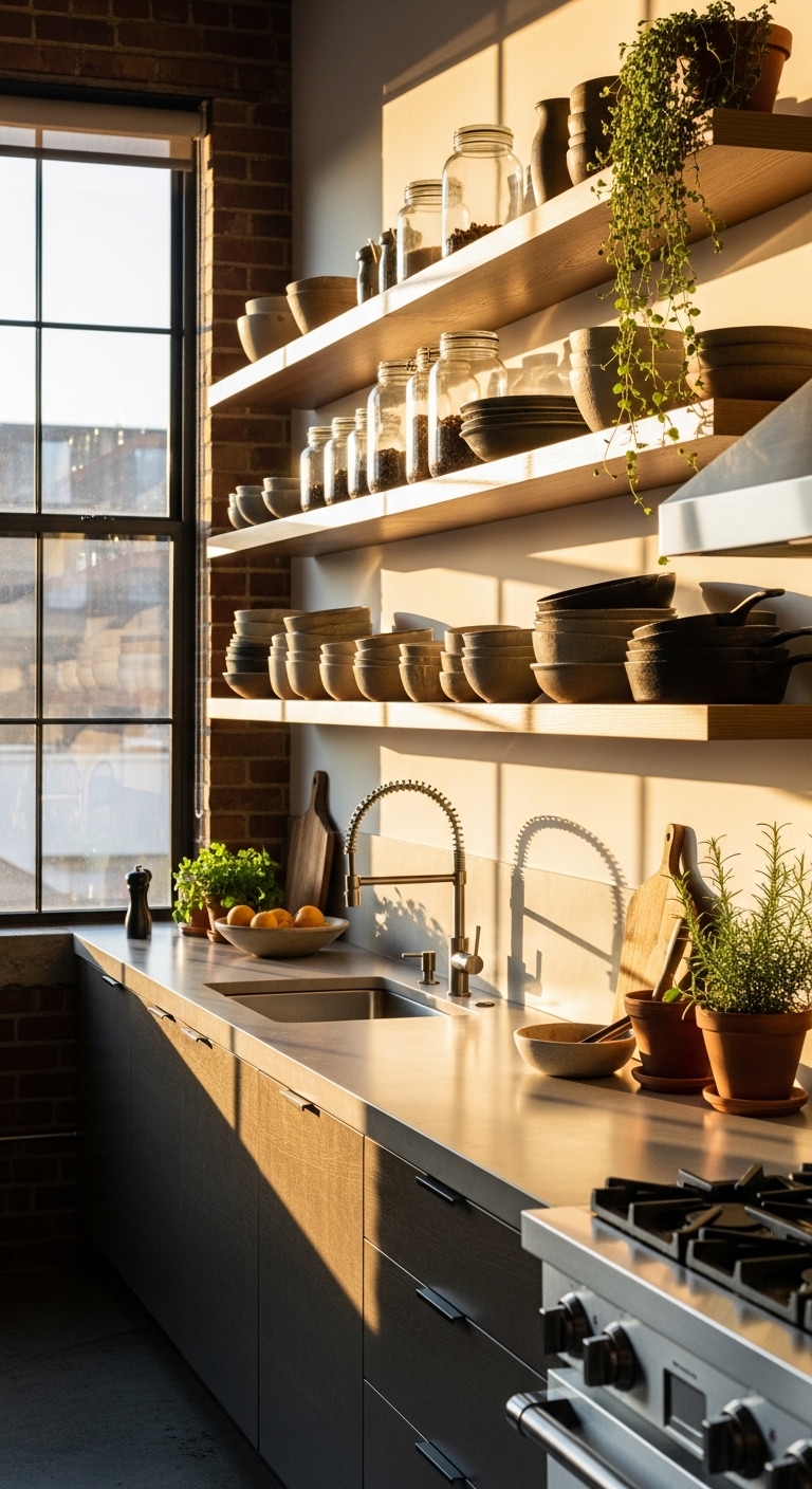 Use warm-toned wood for the shelves — walnut or white oak are both beautiful. Style them with purpose: matching ceramics, glass storage jars for dry goods, a few cast iron pieces, and small herb plants. Keep them edited — open shelves show everything, so everything visible needs to be intentional.