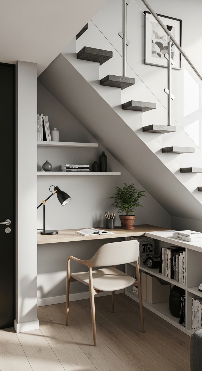 The space under a mezzanine staircase is perfect. A slim wall-mounted floating desk, a task lamp, and two wall shelves above give you everything you need without taking up floor space. Separate it visually from the living zone with a low bookshelf or a pendant light positioned specifically above the desk.