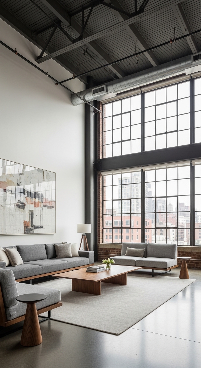Look for sofas with legs under 6 inches. Choose coffee tables under 14 inches tall. Consider a floor cushion section for casual seating. The contrast between low furniture and high ceilings is one of the most satisfying visual tricks in loft design.