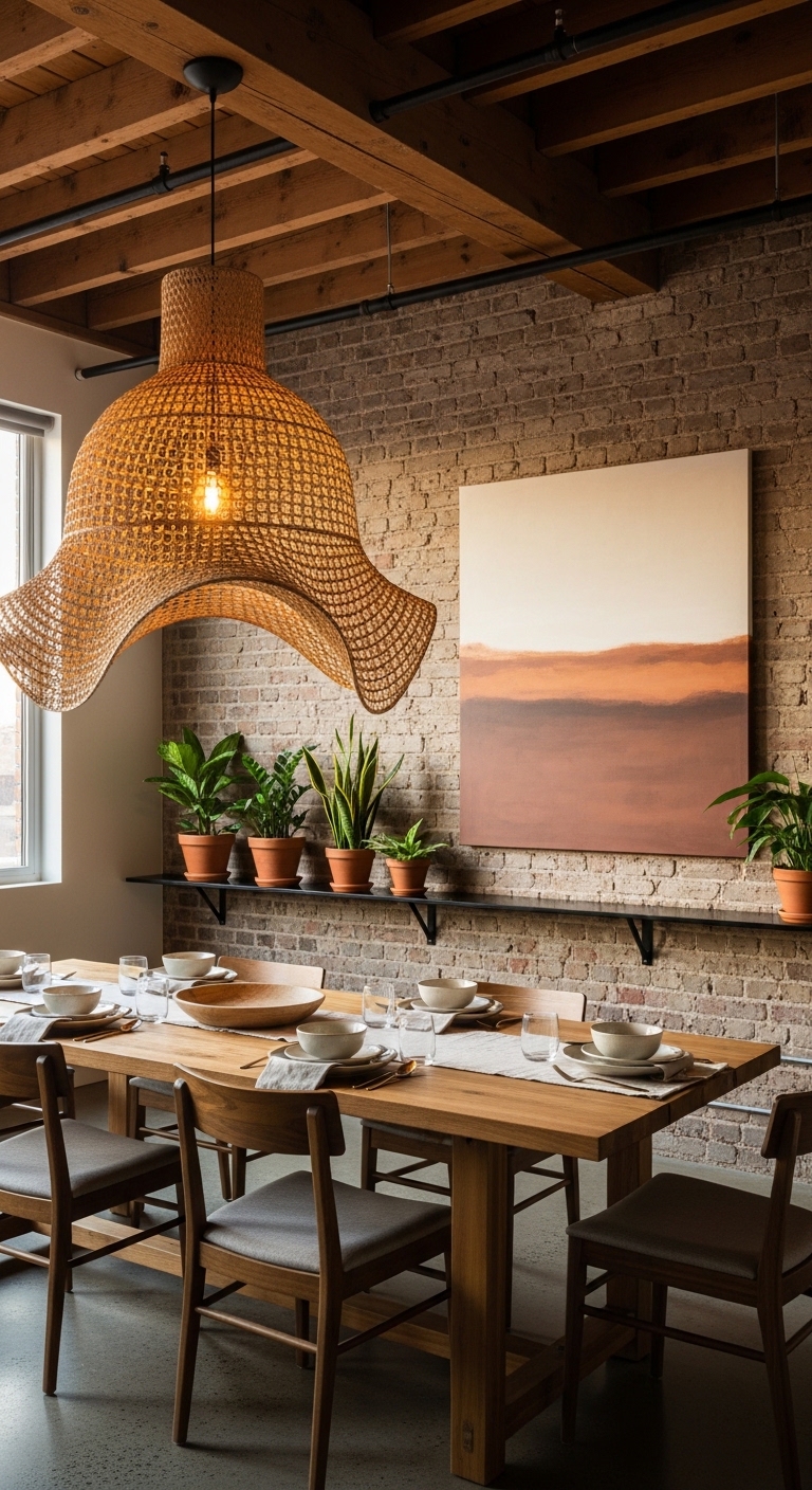 Oversized rattan dome pendants, woven grass spheres, branching metal fixtures, or hand-blown glass pendants in amber — any of these hung at the right height over a dining table become the first thing guests notice when they walk in. Size up dramatically from what you’d instinctively choose.