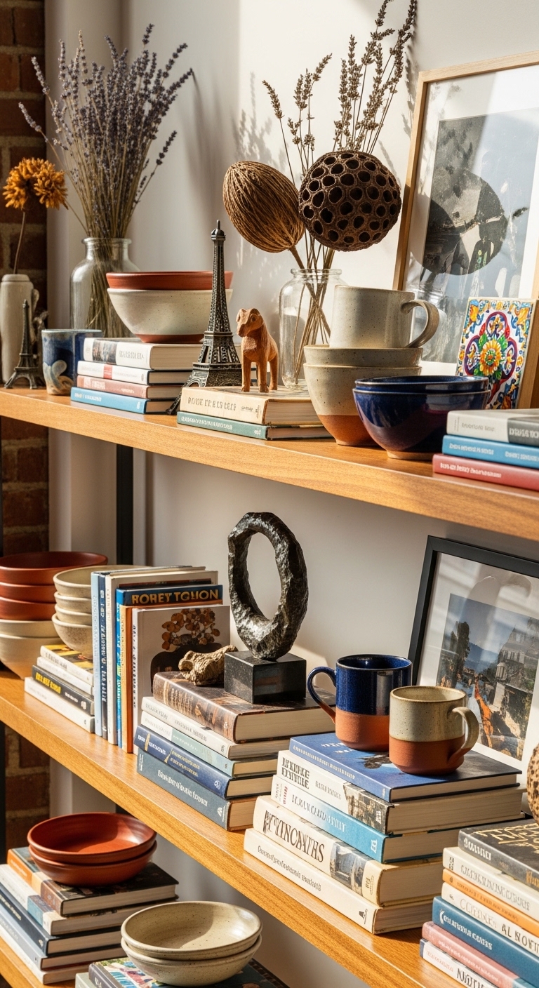 - Leave some shelves partially empty — negative space looks intentional, not incomplete