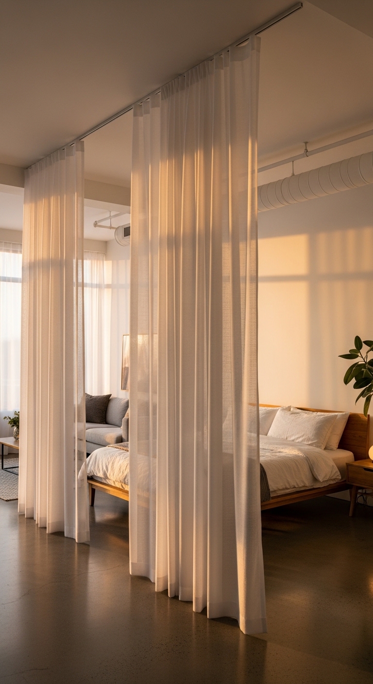 Here’s a loft decorating secret that interior designers swear by: tall curtains make everything feel more luxurious. When you hang curtains from the very ceiling — not from a low rod near the window — you draw the eye upward and add visual warmth to all that exposed height.