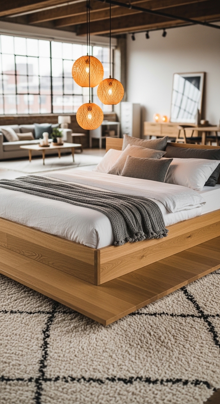 When your bedroom doesn’t have walls, you need another way to say “this is the sleeping space.” A raised platform bed does this beautifully. Even a 4–6 inch elevation change is enough to signal a different zone without blocking sight lines.