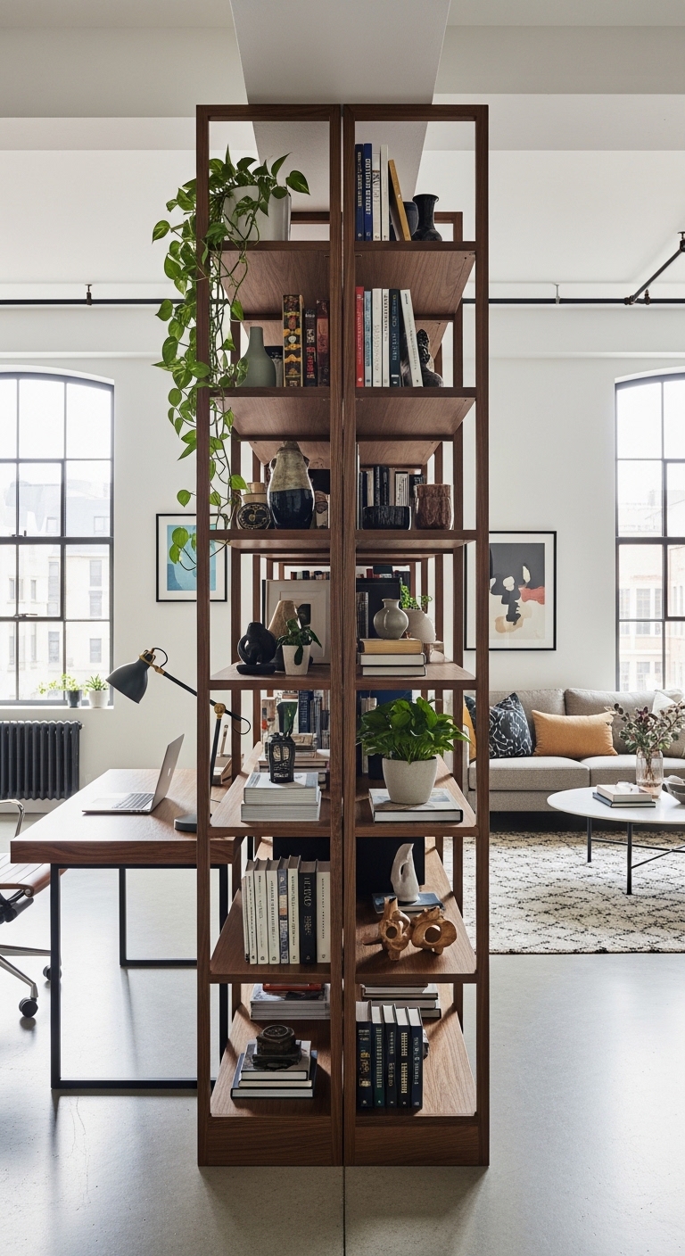 One of the smartest functional dividers you can use in a loft is a pair of tall bookshelves placed back-to-back. You get storage on both sides, a visual boundary between two zones, and you maintain the open, airy feel because the shelves don’t reach the ceiling and block light.